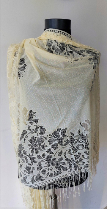 Eșarfa din imagine este realizată din dantelă fină, de culoare crem, cu un aspect delicat și elegant. Materialul este semitransparent, iar motivele florale îi oferă un aer romantic și rafinat. Marginile sunt decorate cu franjuri subțiri, care adaugă fluiditate și mișcare. Poate fi purtată atât la ținute elegante, cât și pentru a adăuga un plus de feminitate unor outfituri simple.