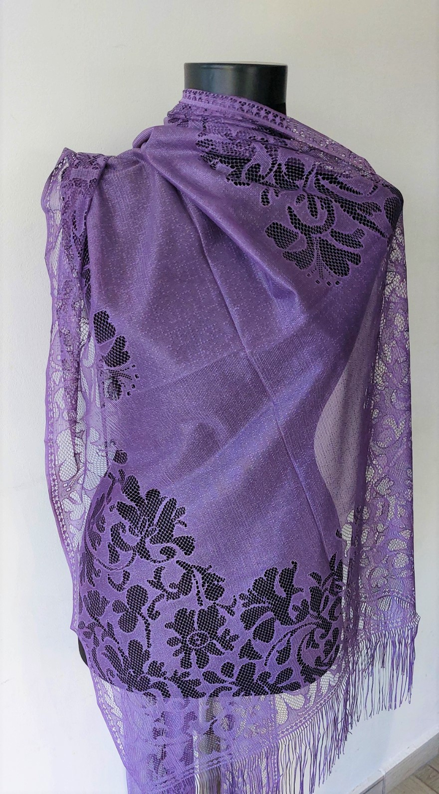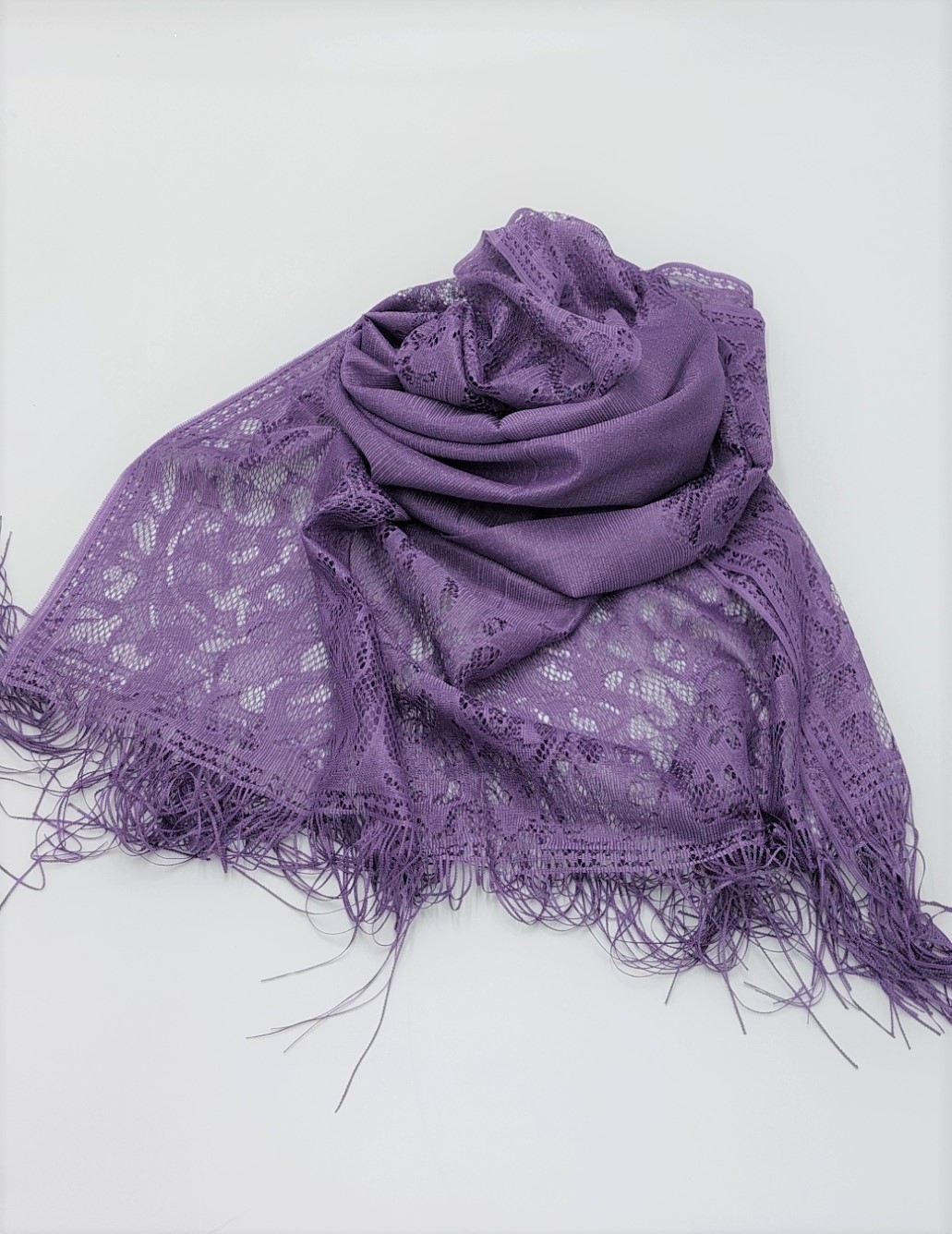 Eșarfa din imagine este realizată din dantelă fină, de culoare crem, cu un aspect delicat și elegant. Materialul este semitransparent, iar motivele florale îi oferă un aer romantic și rafinat. Marginile sunt decorate cu franjuri subțiri, care adaugă fluiditate și mișcare. Poate fi purtată atât la ținute elegante, cât și pentru a adăuga un plus de feminitate unor outfituri simple.
