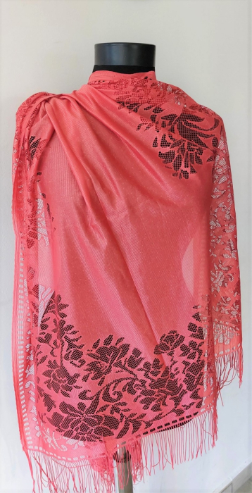 Eșarfa din imagine este realizată din dantelă fină, de culoare crem, cu un aspect delicat și elegant. Materialul este semitransparent, iar motivele florale îi oferă un aer romantic și rafinat. Marginile sunt decorate cu franjuri subțiri, care adaugă fluiditate și mișcare. Poate fi purtată atât la ținute elegante, cât și pentru a adăuga un plus de feminitate unor outfituri simple.